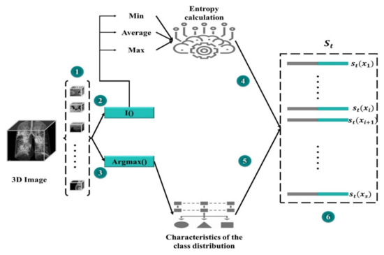 A compact representation is essential to minimize high memory utilization owing to pixel-level predictions. SMc divides the data into segments, and compressed feature vectors are produced for each of them. Then, for each region, two feature sets are concatenated: one based on the feature vectors from MAS_SEG and the other one for the purpose of prediction uncertainty that is characterized by the Shannon entropy. The first group of features (i) is a (normalized) set used to extract projected number of pixels for each class. Furthermore, the predictor′s uncertainty with entropy is calculated as a function of the probability of the predicted classes. The entropy of each pixel position is calculated for each region to produce a map of spatial entropy. To wrap (compress) this representation, the entropy map is subjected to min, mean, and max pooling to produce a map of subsampled features. Another group of features (ii) is produced by flattening and concatenating the features of entropy.