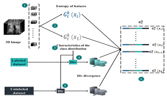 Each sub-action is a series of distinct accomplished actions with class distribution and entropy features (as appeared in representation of the state), a similarity measure from one side between the region and class set , and on the other side between region and set . The idea is that MD will learn to build up a further class-balanced mask set while continuing to sample from set . This could help in balancing the datasets of segmentation and improving whole performance. With each potential candidate region, in a group , we calculate the divergence (Div) between two sides, on the one hand, the class distributions in the region x for each prediction map (projected as the normalized number of predicted pixels in each class), on the other hand, the class distributions of marked and unmarked areas.