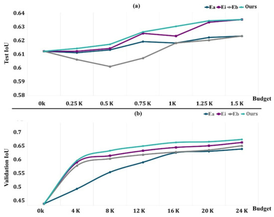 Figure 8a depicts the findings on COVID-19-B for various budget amounts. Except for the 1.5k areas, where we obtain performance comparable to that of Ei, our technique outperforms the baseline performance for any given budget. We believe that because the dataset contains a limited number of pictures, selecting 1.5k areas already achieves more than 98 percent of the maximum performance, and the differences between our technique and Ei are trivial. Surprisingly, Eb is worse than Ea, particularly for low-budget situations when training with newly obtained labels gives no further details. It rapidly adjusts to the training, producing a worse outcome than with the first weights.