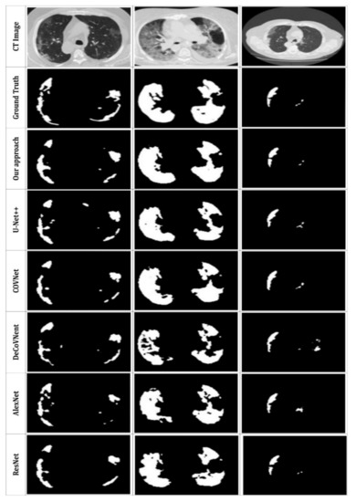 Based on Figure 10, the suggested method can properly segment the lung CT images and detect the infected areas, specifically the minor ones. In contrast, the U-Net++ network presents more over-segmented regions. Further COVNet, DeCoVNet, AlexNet and ResNet present good segmentation results but with less definite for smaller segments. Our segmentation results are the closest to the ground truth. This proves the efficiency of the proposed approach. Furthermore, we can also see that the use of MAS to extract the image masks can accurately enhance the segmentation and allow the detection of complicated infection areas in CT scans, which indicates the efficacy of the strategy described in this study.