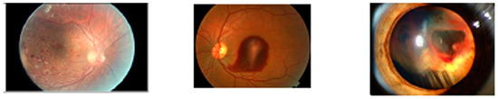 Neovascularisation (left), preretinal hemorrhage (middle), and retinal detachment (right) [20,21,22].
