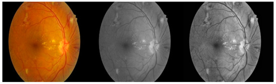 To improve the image contrast, one of the standard techniques used is HE [24]. Fuzzy image enhancement is the technique to produce an image of more sophisticated divergence than the original image. High-resolution fundus images are hard to interpret, so pre-processing of the image is required to improve the image’s excellence. The main advantage of pre-processing is to classify the input image effectively. We applied fuzzy image processing to convert the color image to the grayscale image and to proceed further. For better visualization and detection of the red lesion for medical images, a technique called FC-CLAHE [25] was used, and the fuzzy logic contrast enhancement technique helped to improve the retina image in the proposed model. The pre-processing phase of the retina image is shown in Figure 4.