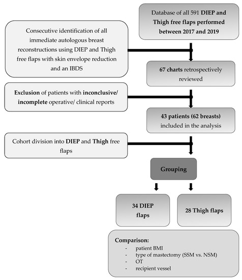 Consort Flowchart (DIEP, deep inferior epigastric artery perforator flap; Thigh, transverse myocutaneous gracilis flap or profunda artery perforator; BMI, body mass index; SSM, skin sparing mastectomy; NSM, nipple sparing mastectomy; OT, operation time).