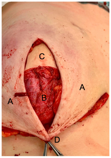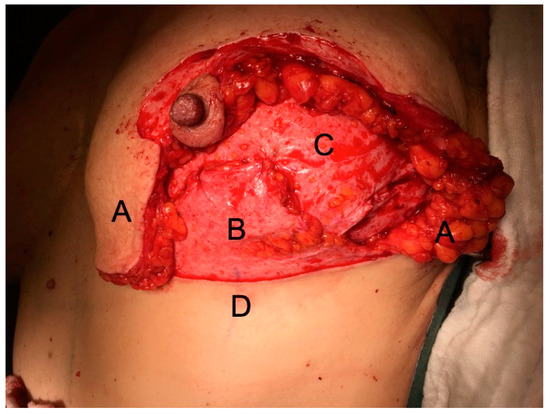 Intraoperative photograph of a DIEP flap inset after an SSM: (A), mastectomy skin flaps; (B), deepithelialized IBDF; (C), DIEP flap—the skin island to monitor flap perfusion can be excised later or it may serve for nipple reconstruction; (D), T-junction.
