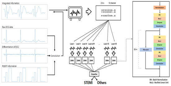 We applied the DLM to classify STEMI-ECGs from NSR-ECGs. Compared with typical convolutional neural network (CNN) models, which have been widely used in ECG studies, DLM has some advantages for STEMI detection [16,17,18]. First, the DLM processes the 12-lead (each channel) information separately by applying weight shared encoders for each channel, which can reduce information loss by including each lead. Typical models, which have a single encoder for 12 leads, usually aggregate channel information in the first layer. However, since the ST elevation feature could appear on a few leads associated with the obstruction of culprit arteries, the DLM showed better performance in the STEMI detection task than the single encoder. Second, the DLM can optimally process the ECG feature input. The major ECG feature input is as follows: P wave, QRS complex, T wave, and the shape, amplitude, and latency of each wave. In the application of a conventional CNN with a single encoder, the aggregation of this channel information can impede rapid ECG input processing.