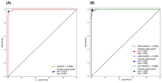 DLM showed an AUROC of 0.998 (95% CI 0.996–0.999) for STEMI detection compared with NSR-ECGs in the external validation. Based on the Youden index score, SEN = 0.974 and SPE = 0.992 (Figure 3). In the analysis by the sort of culprit arteries, the AUROC performance of STEMI detection was as follows: RCA, 0.998 (CI 0.995–0.999); LAD, 0.998 (CI 0.996–0.999); LCX, 0.999 (CI 0.998–1.000). There were no significant differences in the comparison of AUROC performance according to culprit arteries (DeLong’s test; RCA vs. LAD, p = 0.398; LAD vs. LCX, p = 0.369; RCA vs. LCX, p = 0.169).