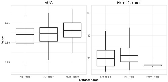 We can observe a slowly increasing average AUC from 0.816 (Standard Deviation (SD)) = 0.03) in no_logic to 0.819 (SD = 0.03) in all_logic and finally 0.829 (SD = 0.03) in the num_logic dataset. When looking at the number of selected feature averages and its variation, we can observe that it slowly increases from 21.7 (SD = 11.18) in no _logic to 23.7 (SD = 10.09) in all_logic but it then almost halves to 13.35 (SD = 0.63) in the num_logic dataset. The SD is steadily increasing in the first two cases, but then it decreases sharply to below 1 (SD = 0.63), which means that out of the 100 repetitions in 92 cases 13 or 14 features were selected in the num_logic dataset. This indicates a very stable final prediction models when comparing num_logic based solutions to no_logic or all_logic.