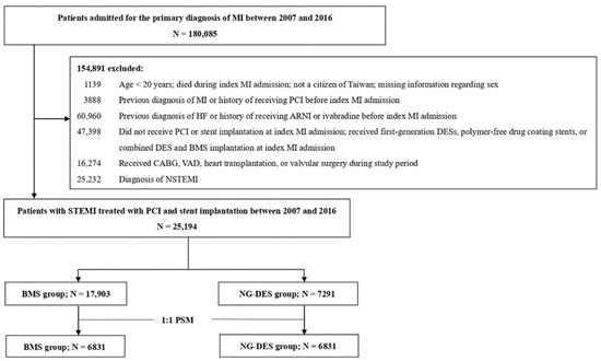 Patient selection process. ARNI—angiotensin receptor/neprilysin inhibitor; BMS—bare-metal stent; CABG—coronary artery bypass grafting; DES—drug-eluting stent; HF—heart failure; MI = myocardial infarction; N—number; NG-DES—new-generation drug-eluting stent; NSTEMI—non-ST-elevation myocardial infarction; PCI—percutaneous coronary intervention; PSM—propensity score matching; STEMI—ST-elevation myocardial infarction; VAD—ventricular assist device.