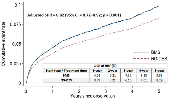 Cumulative incidence of HHF for competing risk among patients with STEMI receiving NG-DES or BMS implantation. BMS—bare-metal stent; CI—confidence interval; CICR—cumulative incidence competing risk; HHF—hospitalization for heart failure; NG-DES—new-generation drug-eluting stent; SHR—subdistribution hazard ratio; STEMI—ST-elevation myocardial infarction.