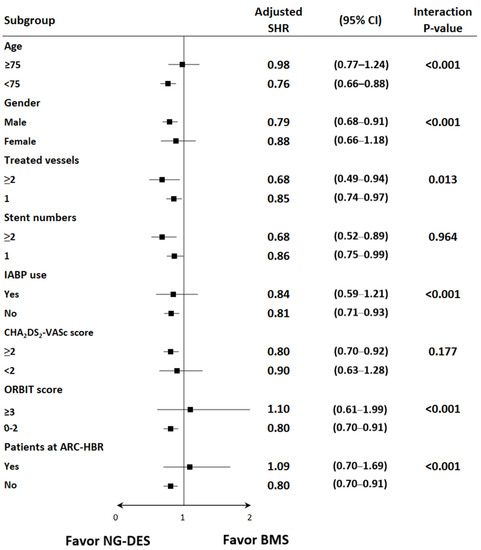 Subgroup analysis of the risk of HHF among patients with STEMI receiving NG-DESs (reference group) and BMSs. Adjusted SHR was adjusted for baseline covariates, including age, sex, year of index MI admission, comorbidities, prescribed medications, use of IABP during PCI, multivessel PCI, CHA2DS2-VASc scores, ORBIT scores, and various ARC criteria for HBR. Abbreviations are defined in the footnote of Table 1.