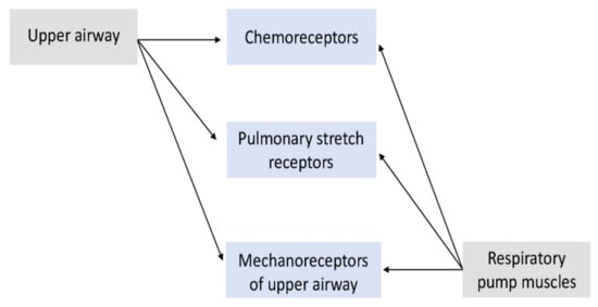 These fluctuations of arterial blood pressure, heart rate, and respiration occur in NREM and REM sleep and during transitions between sleep and arousal [17]; they may explain the sensitivity differences in hypoxia–hypercapnia, a major pathophysiologic element in sleep-disordered breathing [5]. Pulmonary stretch receptors work in coordination with central and peripheral chemoreceptors as the corresponding reflexes affect upper airway and respiratory pump muscles. The relationship is displayed in detail in Figure 1. A reduction in respiratory muscle tone occurs during NREM sleep but is more prominent during REM [18], attenuating the occlusion pressure responses to both hypoxia and hypercapnia in REM sleep stage, a clinical phenomenon consistent with emerging even in normal people [19]. In this context, arousals emerge, fragmenting sleep architecture. A protective reflex is activated by local upper airway (UA) mechanoreceptors due to the negative pressure in the UA, preventing its collapse by enhancing activity of UA dilators [20]. This reflex re-establishes ventilation in an alternative-to-arousal manner.