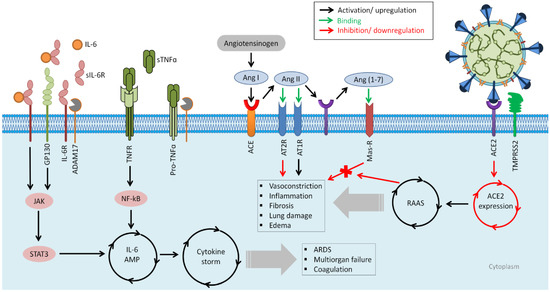 Scheme of possible targets for developing therapeutics against COVID-19 and the presented cytokine release syndrome (CRS). SARS-CoV-2 utilizes ACE2 and TMPRSS2 as cell entry receptors. As a result of SARS-CoV-2 infection, the renin–angiotensin system (RAAS) is overactive. Angiotensin-converting enzyme (ACE) converts angiotensin I (Ang I) to angiotensin II (Ang II) under physiological circumstances, resulting in increased vasoconstriction, inflammation, fibrosis, lung injury, and edema. Ang I is inactivated by angiotensin-converting enzyme 2 (ACE 2), which produces angiotensin 1–7 (Ang 1–7), which interacts with the G-protein-coupled receptor Mas. Because it antagonizes the effects of Ang I, this interaction is thought to be vasoprotective. SARS-CoV-2, on the other hand, decreases ACE2 expression, resulting in RAAS overactivation and increased lung injury and edema. Through angiotensin receptor type 1 (AT1R), AngII functions as a vasoconstrictor and a pro-inflammatory cytokine. AT1R can promote fibrosis, inflammation, acute lung injury, and collagenase activity decrease. Instead, AT2R stimulation protects against renin–angiotensin system (RAS) activation by eliciting anti-inflammatory, antioxidant, anti-fibrotic effects, reduction in vascular permeability, and edema. The hyper-activation of the NF-κB transcription factor by SARS-CoV-2 through pattern recognition receptors (PPRs) causes cytokine-related syndrome (ARDS). Angiotensin 2 (AngII) elevates in the serum because SARS-CoV-2 occupies ACE2 molecules, which, in turn, reduces Ang II breakdown. The inflammatory cytokines, including TNFα and IL-6-soluble (s)IL-6R, are activated by the accumulated AngII via disintegrin and metalloprotease 17 (ADAM17), and the IL-6 amplifier (IL-6 AMP) is subsequently activated, which explains the magnified NF-κB activation by the co-activation of NF-κB and STAT3 transcription factors. In a variety of IL-6Ra-negative nonimmune cells, including fibroblasts, endothelial cells, and epithelial cells, ADAM17 stimulation also changes the membrane form of IL-6Ra to the soluble form (sIL-6Ra), followed by the gp130-mediated activation of STAT3 via the sIL-6Ra–IL-6 complex. As a result, the simultaneous inflammatory cascades of NF-κB and STAT3-mediated signaling further enhance the NF-B activity and form an inflammatory circuit, the IL-6 AMP, which defines an IL-6-based positive feedback loop for inflammation. As a result, the cytokine storm generated by NF-B hyperactivation in IL-6 AMP might result in lethal symptoms such ARDS, severe pneumonia, multiorgan failure, and coagulation. The underlined molecules indicate possible therapeutic targets for cytokine release syndrome (CRS).