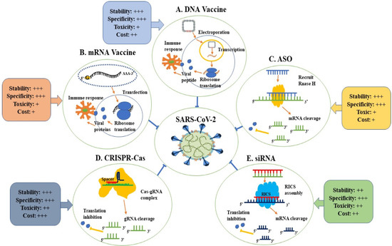 Among the promising strategies to combat SARS-CoV-2 is nucleic acid-based therapeutics. Therapeutic nucleic acids (TNAs) include many pioneering technologies such as antisense oligonucleotides (ASOs), micro RNAs (miRNAs), small interfering RNAs (siRNAs), clustered regularly interspaced short palindromic repeats–CRISPR-associated protein (CRISPR–Cas), and mRNA vaccines [152]. Figure 3 shows the mechanism of action and criteria of each TNAs. TNAs are capable of targeting specific sequences of interest in the viral genome with a focus on the highly conserved sequence, such as targeting the highly conserved RNA-dependent RNA polymerase (RdRp) gene in the open reading frame 1ab (ORF1ab) region and the N gene by CRISPR-associated RNAs (crRNAs) deployed by the Cas13d system [153]. These antiviral therapeutics can inhibit viral gene expression [154] either during or after transcription [155]. Hence, nucleic acid-based therapeutics present great potential in combating SARS-CoV-2 infection. The most needed feature nowadays is scalable, rapid production; hence, nucleic acid-based therapeutics that possess this feature have the potential to be applied globally. Based on the published articles [152,156,157,158,159], we believe that mRNA vaccines, DNA vaccines, CRISPR, and ASO are more stable than the siRNA approach. Still, there have been no statistically significant comparative studies published to date. Despite that, we believe that the CRISPR systems will be more expensive and possibly harmful than all other approaches in the future. However, we think that ASO and mRNA would be the most cost-effective method.