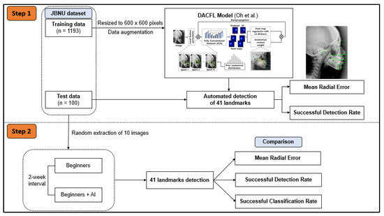 Workflow diagram of the study plan. In step 1, JBNU dataset including 1193 images for training and 100 images for testing was used to evaluate the performance of the DACFL model in clinical applications. In step 2, 10 images were extracted randomly from JBNU test data to evaluate the effect of DACFL-based support on the clinical skills of beginners in cephalometric diagnosis. Abbreviations: AI, artificial intelligence; DACFL, deep anatomical context feature learning; JBNU, Jeonbuk National University.