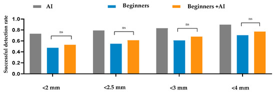 Comparison between the beginner-only and beginner–artificial intelligence groups in terms of the successful detection rate. A t-test was applied to compare the average successful detection rates between the beginner-only and beginner–AI groups within 2, 2.5, 3, and 4 mm thresholds. The beginner–AI collaboration improved the successful detection rates within 2, 2.5, 3, and 4 mm thresholds. Abbreviations: AI, artificial intelligence; ns, not significant.