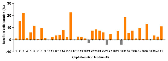 Benefit of beginner–AI collaboration in the detection of cephalometric landmarks. Based on successful detection rate for each landmark within a 2 mm threshold, the benefits of beginner–AI collaboration were analyzed. In general, this collaboration showed a positive impact on the majority of cephalometric landmarks.