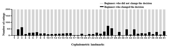 Number of decision changes among beginners across 41 landmarks. In the second experiment, the beginners traced the anatomical landmarks on 10 images with the AI’s answer view. The recorded changes are represented as number of ratings. In general, the number of decision changes was small despite being shown at most anatomical landmarks.