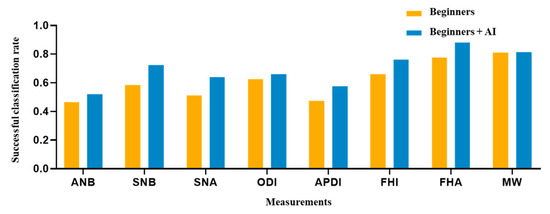 The AI, beginner–AI, and beginner-only groups achieved SCRs of 83.75%, 69.69%, and 61.31%, respectively (Table 6). In the AI group, the SNA (100%) and FHA (100%) exhibited the highest SCR, while the ANB (60%) exhibited the lowest SCR. In the beginner-only group, the MW (81%) exhibited the highest SCR, while the ANB (47%) exhibited the lowest SCR. Among beginner–AI group, the FHA (88%) exhibited the highest SCR while ANB (52%) exhibited the lowest SCR. A comparison between beginner-only and beginner–AI groups in terms of eight measurement parameters is shown in Figure 5.