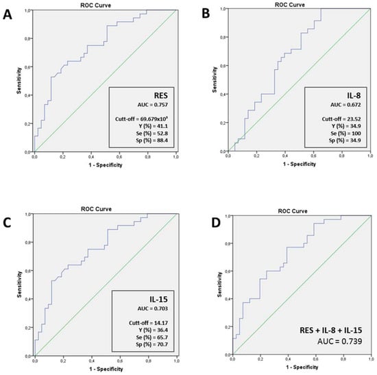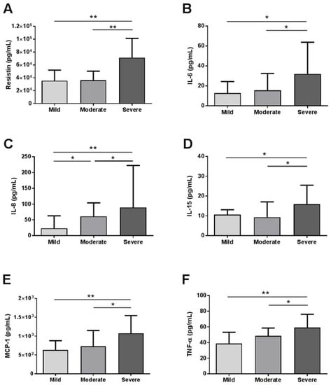 Then, we evaluated the baseline circulating levels of cytokines of these patients, and we observed that resistin, IL-6, IL-8, IL-15, MCP-1 and TNF-α levels were significant different between groups. These differences were graphically represented in Figure 1, where we can see that circulating levels of these cytokines were increased between mild and moderate–severe pneumonia.