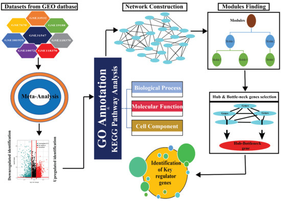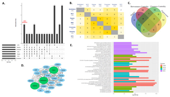 Network analysis is critical for providing information about the regulatory roles of the genes by utilizing protein–protein interaction data [34]. The study of the PPI network of DEGs was carried out using STRING database (http://string-db.org/ accessed on 13 September 2020) [35]. The differentially expressed genes (DEGs) were submitted to the STRING database for PPI network construction. Furthermore, the network generated was uploaded to the Cytoscape software for gene network visualization and downstream analysis for key regulator identification using various plug-ins like CytoHubba, CytoNCA, etc.