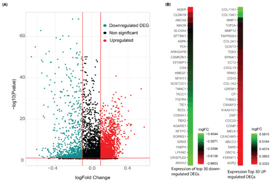 The volcano plot shows an overview of differentially expressed genes. (Figure 2A). The top 30 upregulated and downregulated DEGs based on fold changes are shown in Figure 2B.