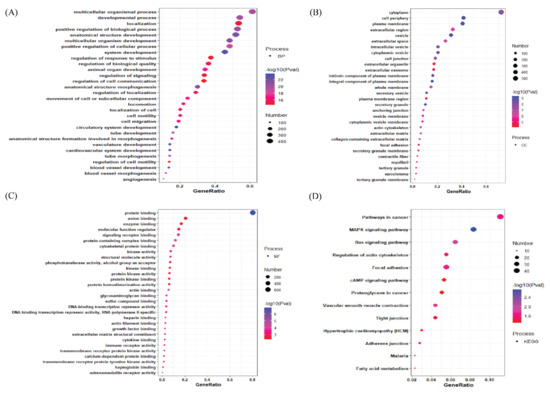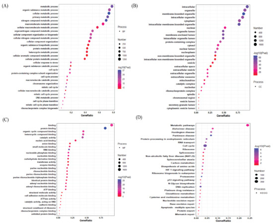 The bubble plot demonstrates that the top most upregulated genes are mainly involved in the metabolic process, organic substance metabolic process, and cellular metabolic process (Figure 3A). Furthermore, the top-most upregulated genes are present in the intracellular organelle, membrane-bound organelle, etc. (Figure 3B). The top-most upregulated genes are involved in protein binding, organic cycle compound binding, etc. as evident from their molecular functions (Figure 3C). Apart from these, the top-most upregulated genes are involved in the metabolic and disease pathways, like Alzheimer’s disease pathway, Huntington disease pathway, etc. (Figure 3D). In Biological Processes section for the top downregulated genes, it is shown that they are involved in the multicellular organismal process, developmental process, localization process, etc., (Figure 4A).