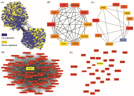 In our analysis, a total of 2700 DEGs were submitted to STRING for the construction and analysis of the network. The network analysis shows that the protein–protein interaction network has 2637 interacting nodes and 31,349 edges (Figure 5A). Further analysis of this network was executed using Cytoscape. After analyzing, we found the top-10 hub genes (genes with highest degrees), GAPDH, IL6, CDK1, HSP90AA1, EGF, PTEN, CASP3, HSPA8, CDC20, and PLK1 as per the decreasing order of degree values. Also, we found top 10 bottleneck genes EIF4A1, HSPA8, GNL3, SPN, CDK1, ZEB1, HSP90AA1, EPRS, TARS2, and DICER1. as per the decreasing order of highest bottleneck score (Figure 5B,C and Supplementary File S4).