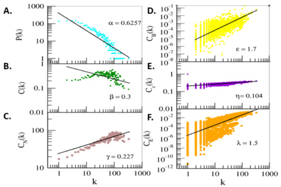 Node degree distribution, clustering coefficient, and neighborhood connectivity were found to follow the hierarchical structure of the network. Centrality values, betweenness (, closeness (, and eigenvector ( supported the network’s hierarchical nature. The positive value of exponents of these centrality parameters, shown in Equation (2), indicate the strong regulatory role of the leading hubs in the NSCLC network (Equation (2)). All six distributions of topological properties were fitted with power laws y = A0xA1 (Figure 6).