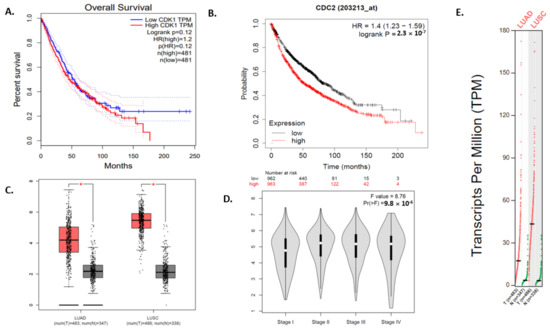 The survival, expressional and pathological analysis of CDK1. (A) Survival plot for CDK1 obtained from GEPIA (gepia.cancer-pku.cn). (B) Survival plot of CDK1 (CDC2) from KM-Plotter. (C) Expression profile of CDK1 in normal (grey) and tumor (red) samples of LUAD and LUSC datasets. (p < 0.05) (D) Pathological stage condition for CDK1 genes using LUAD and LUSC datasets. (E) Expression of CDK1 gene based on RNA-seq data from the TCGA database assessed by TPM (Transcripts per million) from GEPIA. One * (star) signifies p value less than 0.05. It is updated in the text.