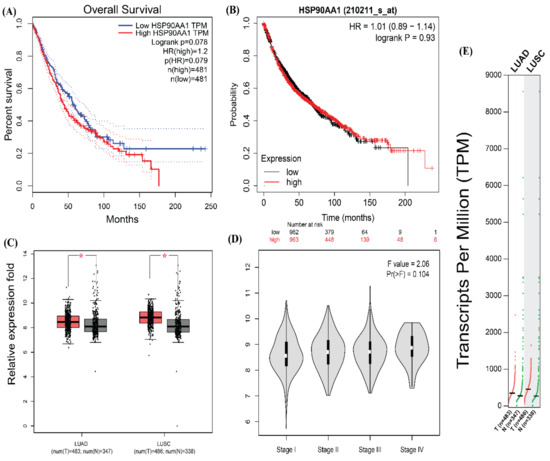 The survival, expressional and pathological analysis of HSP90AA1. (A) Survival plot for HSP90AA1 obtained from GEPIA (gepia.cancer-pku.cn). (B) Survival plot of HSP90AA1 from KM-Plotter. (C) Expression profile of HSP90AA1 in normal (grey) and tumor (red) samples of LUAD and LUSC datasets (p < 0.05) (D) Pathological stage condition for HSP90AA1 genes using LUAD and LUSC datasets. (E) Expression of HSP90AA1 gene based on RNA-seq data from the TCGA database assessed by TPM (Transcripts per million) from GEPIA. (Survival analysis is done in GEPIA using log-rank test (Mantel–Cox test), for the hypothesis evaluation.) One * (star) signifies p value less than 0.05. It is updated in the text. One * (star) signifies p value less than 0.05. It is updated in the text.