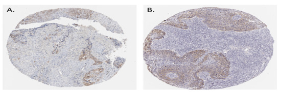 Histological images of CDK1 and HSP90AA1 in squamous cell carcinoma. (A) The sample is from Male, age 54 (HPA003387), Lung (T-28000) Squamous cell carcinoma, NOS (M-80703), Patient id: 1727 and for HSP90AA1 (B) The sample is from Male, age 68 (CAB002058), Lung (T-28000) Squamous cell carcinoma, NOS (M-80703), Patient id: 1048.