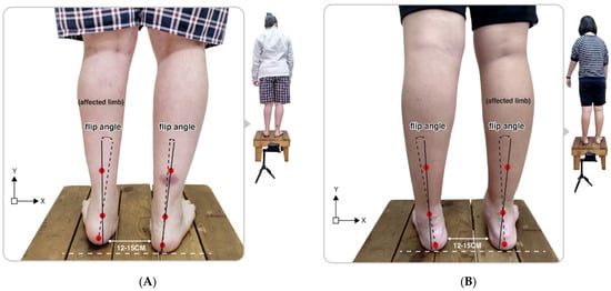 Illustration of the upright posture of the representative participant in (A) the left hemiplegic CP and (B) the right hemiplegic CP group. Flip angle (static rearfoot angle) was calculated based on the intersection of two straight lines produced from the three positioning markers on the lower legs.