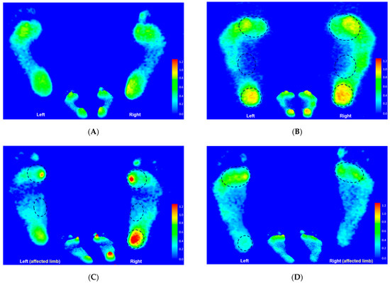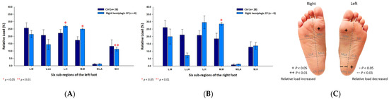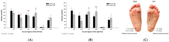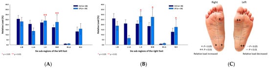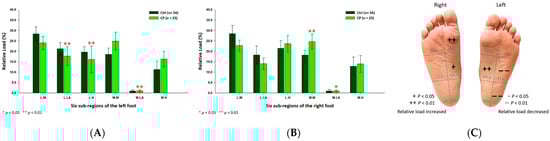 In addition, the male CP group’s six subregional relative loads were primarily distributed at the medial metatarsals (left foot: 22.54% ± 7.40%; right foot: 27.57% ± 8.28%; p < 0.05) and the lateral heels (left foot: 23.86% ± 4.21%; right foot: 28.05% ± 5.10%; p < 0.05) of both feet, and the medial heel (17.58% ± 7.70%; p < 0.05) of the right foot (Figure 3).