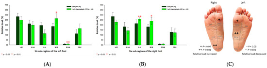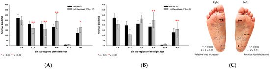The percentage of six subregional relative loads of (A) left and (B) right feet in female students during static stance. The changes in pressure distribution are illustrated in (C) foot plantar diagram. Significant differences between the female control group and the female left hemiplegic CP group were determined as * p < 0.05 and ** p < 0.01.