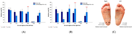 The percentage of six subregional relative loads of (A) left and (B) right feet in male students during static stance. The changes in pressure distribution are illustrated in (C) foot plantar diagram. Significant differences between the male control group and the male left hemiplegic CP group were determined as * p < 0.05 and ** p < 0.01.