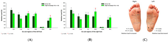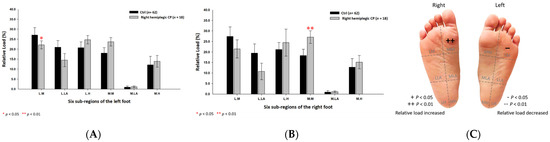 The percentage of six subregional relative loads of (A) left and (B) right feet in total students during static stance. The changes in pressure distribution are illustrated in (C) foot plantar diagram. Significant differences between the control group and the right hemiplegic CP group were determined as * p < 0.05 and ** p < 0.01.
