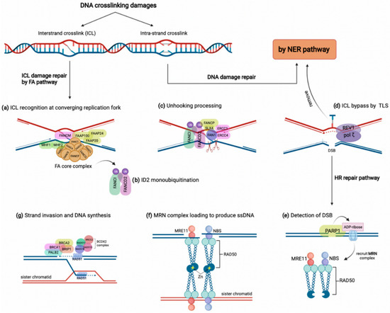 DNA crosslinking damages are caused by the covalent linkage between two nucleotides residing on either two complementary strands of DNA (inter-strand crosslink) or the same DNA strand (intra-strand crosslink) [34]. These crosslinks might arise from either exogenous sources such as mitomycin C and platinum-based chemotherapeutic agents or derive from endogenous metabolites comprising aldehydes and nitrous acid, to name a few [14,33]. Although intra-strand crosslinks are easily eliminated by the nucleotide excision repair (NER) pathway, inter-strand crosslinks must be repaired through the FA pathway involving several steps and proteins [14]. As shown in Figure 1, the proteins encoded by FANC genes in conjunction with several FA-associated factors collaborate to overcome inter-strand crosslink lesions [14]. The FA pathway triggers inter-strand crosslink repair principally during the S phase of the cell cycle by detecting two converging replication forks that formed the X shape construct near the inter-strand crosslink site [35]. In this procedure, FANCM, along with some other FA-associated proteins (FAAPs), senses the stalled replication fork on inter-strand crosslink damage. They act as the loading platform for assembling proteins of the FA core complex, including FANCA, B, C, E, F, G, L, M, T, and histone fold dimer proteins (MHF1, MHF2) (Figure 1a) [32,36]. The FA core complex as a ubiquitin-ligase conducts the formation and activation of FANCI-FANCD2 heterodimer (ID2 complex) through monoubiquitylation (Figure 1b) [37]. Monoubiquitylated ID2 in a process known as ‘unhooking’ governs nucleolytic incision at collapsed replication forks to cleave the inter-strand crosslink [14,36]. In this process, ubiquitylated FANCD2 recruits and activates several endonucleases comprising FANCP/SLX4, ERCC1-ERCC4 (ERCC4, also named FANCQ) heterodimers, and FAN1 (Fanconi-associated nuclease 1) to tackle the inter-strand crosslink lesion (Figure 1c) [32]. These endonucleases incise the ICL and leave it on one duplex while generating a double-strand break (DSB) on the other duplex [38]. Although the inter-strand crosslink is bypassed by translesion synthesis, the DSBs are repaired by HR (Figure 1d) [39]. For HR, a DSB is detected first by poly (ADP-ribose) polymerase 1 (PARP1) during the S phase. Then, PARP1 marks the lesion site by attaching ADP-ribose molecules to chromatin-bound proteins neighboring the break (Figure 1e) [40]. Consequently, ADP-ribose units recruit the MRE11-RAD50-NBS (MRN) complex to produce single-strand DNA (ssDNA) around the break (Figure 1f) [41]. Meanwhile, some FA components, including FANCS/BRCA1, FANCD1/BRCA2, BRIP1/FANCJ, and PALB2/FANCN, along with the RAD51B-FANCO/RAD51C-RAD51D-FANCU/XRCC2 (BCDX2) complex, promote the attachment of FANCR/RAD51 to the ssDNA overhangs. Finally, FANCR completes the HR repair via attacking the homologous DNA region (Figure 1g) [42]. Indeed, the FA pathway grants the high-fidelity repair of the ICL damages through blocking the error-prone NHEJ pathway and recruiting the FA-pathway-dependent HR repair [32,33].