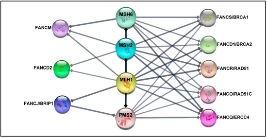 The protein–protein network. The protein–protein interaction (PPI) between MMR proteins comprising MLH1, MSH2, MSH6, PMS2, and 22 FA proteins was exported from the STRING database (high confidence (0.7)) [80] and visualized by using Cytoscape software, version 3.8.2 [81]. The association network shows that FANCS, FANCD1, FANCO, and FANCQ are linked with all selected MMR proteins, while FANCM interacts with MSH6, MSH2, and MLH1. FANCD2 is connected to MSH2 and MLH1, whereas FANCJ is associated with MLH1 and PMS2. The FA proteins without direct association with selected MMR proteins have been excluded.