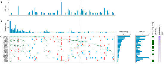 Genetic alterations of the FA genes in primary CRC specimens. Graphics show 139 primary CRC specimens displaying FANC gene mutations from a cohort of 395 cases. (A) Frequency of copy number variations and (B) frequency of mutations per tumor specimen. (C) Type of alterations per gene and per tumor specimen (green circles: missense, frameshift, start lost, stop lost, stop gained mutations; red squares: copy number variation (CNV) change, gain; blue squares: CNV change, loss). Data are from the TGCA program and have been generated from the GDC Data Portal [99].