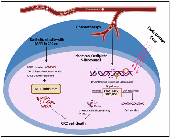 The FA pathway involvement in CRC treatment. The DNA damages caused by radio- and chemotherapy in CRC cells result in cell death. On the other side, up-regulation of the FA pathway components such as RAD51, BRCA1/2, XRCC2, and REV7 leads to HR restoration and drug resistance. The deficiency in the FA pathway components such as BRCA1/2, XRCC2, and RAD51 represents the synthetic lethal relationship with PARP1, which might introduce druggable candidates for PARP inhibitors in CRC cells.