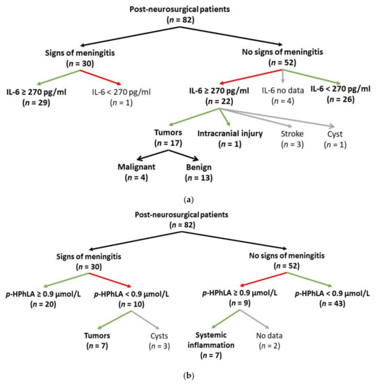 According to the data in Table 2, the patients with signs of post-neurosurgical meningitis had higher median values of leukocyte count, neutrophils, lactate, protein, p-HPhLA (Figure 1a), and IL-6 (Figure 1b), and lower values of glucose.