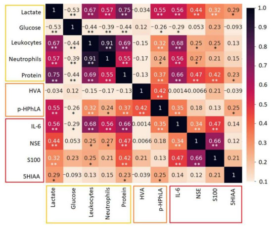 Spearman’s rank correlation coefficients for the different parameters in CSF: clinical and biochemical parameters (lactate, glucose, leukocytes, neutrophils, and protein), aromatic metabolites (HVA and p-HPhLA), and biomarkers (IL-6, NSE, S100, and 5HIAA). Negative correlations for glucose are not colored. * The correlation is significant at p = 0.05 (2-tailed); ** the correlation is significant at p = 0.01 (2-tailed).