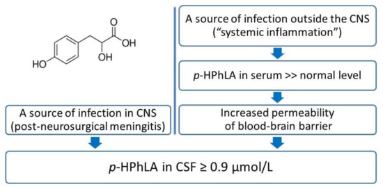 The obtained results could be summarized to a hypothesis about the mechanisms of the p-HPhLA accumulation in CSF (Figure 3). If there is no systemic inflammation in the body, aromatic metabolites of microbial origin (in particular, p-HPhLA) enter the bloodstream from the gut at constant low concentrations, as demonstrated in serum samples of healthy controls [43]. If there is a systemic inflammation in the post-neurosurgical patients with a locus of infection outside of CNS, we should expect elevated concentrations of p-HPhLA in the serum by analogy with the critically ill patients as in previous studies (see Section 1). p-HPhLA is a polar low-molecular-weight aromatic metabolite, and we assume that it can penetrate the blood–brain barrier with increased permeability, resulting in elevated CSF levels of p-HPhLA. Such situation was illustrated by our results in patients without sufficient signs of meningitis but with signs of systemic inflammation in serum (n = 9) and by the similar results of the ROC analysis of the CSF level of p-HPhLA and inflammation in CSF and serum (Table 3).