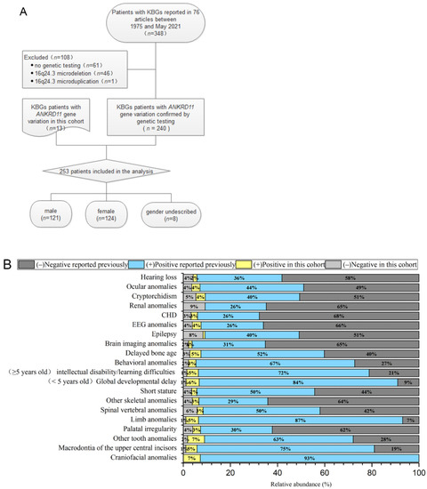 (A) The process of screening the patients. (B) Clinical phenotype frequency of the 253 KBGS patients with ANKRD11 gene variation only.