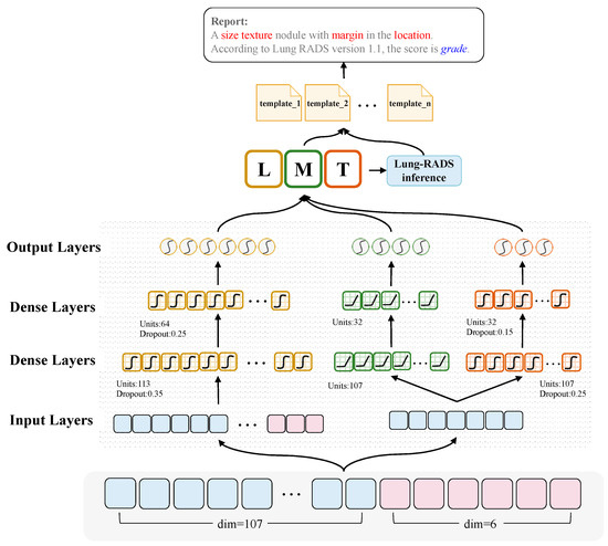 Illustration of the proposed multi-objective deep learning framework for semantic feature prediction. For prediction of the final targets: location (L), margin (M), and texture (T), the input layer of the proposed model is a multi-feature fusion vector that integrates 107-dimensional radiomics feature with 6 extra SISN features extracted from the information of nodule segmentation. Afterwards, there are two dense layers with dropout. The activation of the last two dense and the output layer are different, wherein ReLU is used for predicting Margin and tanh is used for Location and Texture. The final activation function of the output layer to predict results is softmax. Using the prediction results of these three semantic features, the radiology reports can be generated through filling slots of a set of predefined templates.