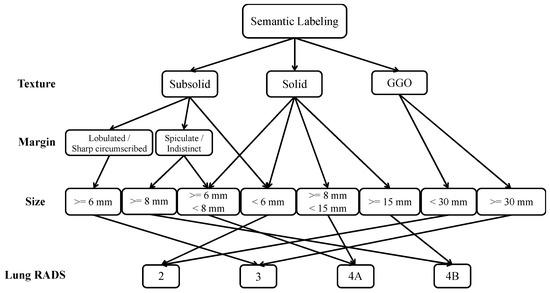 Subsequently, we included Lung-RADS for the report generation module, since it has in recent years become an important indicator of lung cancer [5,37]; as shown in Figure 2, we used the standards of Lung-RADS Assessment Categories Version 1.1, from the American College of Radiology (https://www.acr.org/Clinical-Resources/Reporting-and-Data-Systems/Lung-Rads, 30 October 2020), to formulate the decision process of the Lung-RADS. Once the semantic labels are predicted, the Lung-RADS of the lung CT can be obtained through this process with the predicted semantic labels and extracted radiomics features altogether. After this, the above information is automatically converted into a structured radiology report through the text generation mechanism, which is based on linguistic templates because the content of the report must be highly controllable. In addition, even though a large training dataset is re-quired when developing a text generation model, for medical data and especially labeled CT scans, flawless data are in practice very rare. Thus, a template-based approach is more suitable in this scenario. To develop well-formed linguistic templates for report generation, we started from the templates provided by the RSNA website, and then consulted with professional radiologists in order to refine them. In this way, a proficient radiology report can be generated through slots filling of the predicted semantic features and Lung-RADS information. By connecting a series of modules, radiology reports can be automatically generated from a lung CT scan.