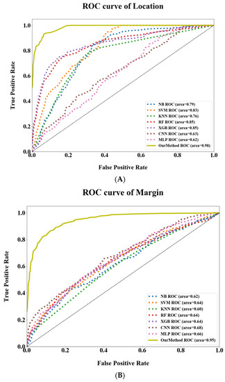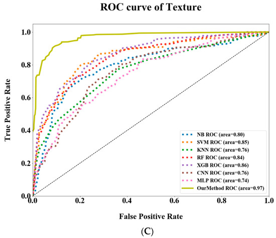 Table 3 displays the comparison results. As a baseline, the NB classifier with a basic statistical model only reached a mediocre performance. Since it only considers features using conditional probability, it is difficult to represent inter-feature relations. The overall F1-score of the NB classifier is 50.93%, and especially for the feature Margin, the F1-score is as low as 27%. Next, the KNN method outperforms NB simply by calculating data similarity in the feature space. This can be attributed to the distribution of data that could be distinctively divided and partially interdependent, resulting in the superior outcome of the KNN. We also looked at the XGB method, which is a gradient boosting decision tree that integrates multiple learners for classification problems. This mechanism effectively learns the discriminative feature set, thus greatly outperforming NB and KNN with an overall F1-score of 66.32%. As for neural network-based methods, since RNN is proven to be applicable to sequential processing and CNN is suitable for visual feature extraction [45,46], these neural models (i.e., RNN, MLP, and CNN) can further improve performances up to about 75%, 84%, and 85%, respectively. Nonetheless, the proposed CT2Rep method not only integrated multiple MLPs that can extract latent features from radiomics features, but also learned the relationship between location, margin, and texture of lung cancer through a joint learning scheme. Moreover, multiple dense layers are stacked to distil discriminative features for the purpose of identifying the target (i.e., semantic feature prediction). Consequently, the CT2Rep method achieves the best precision, recall, and F1-scores among all compared methods. In addition, we evaluated the performances of the compared methods by observing their ROC curves [38,47]. As shown in Figure 3A–C, the true positive rate of our method is superior to those of the compared methods in predicting all three semantic features. In other words, the CT2Rep method is effective in recognizing semantic features from lung CT scans. Finally, we evaluate the performances of the compared methods using the ROC curve on three semantic labels. To plot the curves, the evaluated instances were sorted according to their prediction scores with True Positive Rate and False Positive Rate. Figure 3A–C shows that the CT2Rep is superior to those of the compared methods. In other words, our method is able to accurately predict semantic labels behind CT scans.