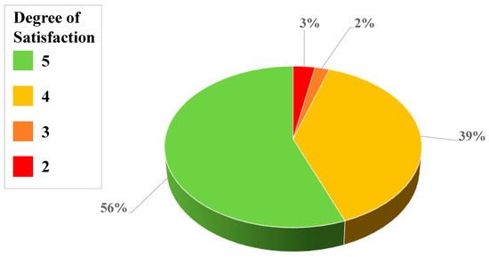 Distribution of satisfaction scores from the questionnaire by professional radiologists. The questionnaire is designed to collect feedback from the professionals regarding the experience when testing the automatic report generation system. The colors indicate different degrees of satisfaction, where green is used for higher scores (more satisfied) in the questionnaire, and red indicates the lower scores (less satisfied).