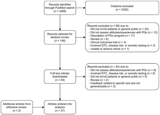 Review flowchart. Abbreviations: PGx, pharmacogenomic; DTC, direct to consumer.