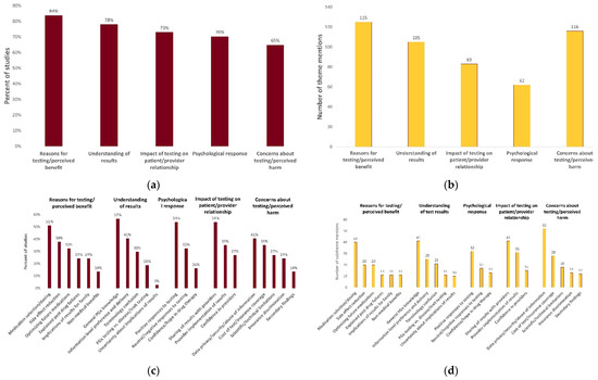 Distribution and frequency of themes and subthemes. (a) Percent of studies expressing each theme; (b) number of theme mentions across included studies; (c) percent of studies expressing each subtheme; (d) number of subtheme mentions across included studies.